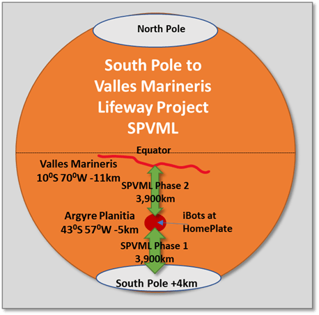 SPVML stands for South Pole to Valles Marineris Lifeway. This project explores the feasibility and profitability of building the first, major hydropower project on Mars. It starts with the assumption that it is not possible to build the project using traditional Earthly means, i.e. lots of public sector money and thousands of human workers. The new Martian way could be to form a 4P organization (Profitable, Private, Public Partnership) that builds the project with hundreds of iBot teams working in parallel along the route using materials manufactured on Earth’s moon.